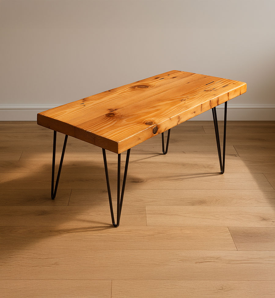 MetalThe Merrick rests on slender metal legs that bring a light, modern touch to its rustic timber top. Minimal in form yet strong in structure, the legs create a striking contrast, allowing the reclaimed Australian pine to take centre stage while adding a sense of elegance and balance to the overall design.